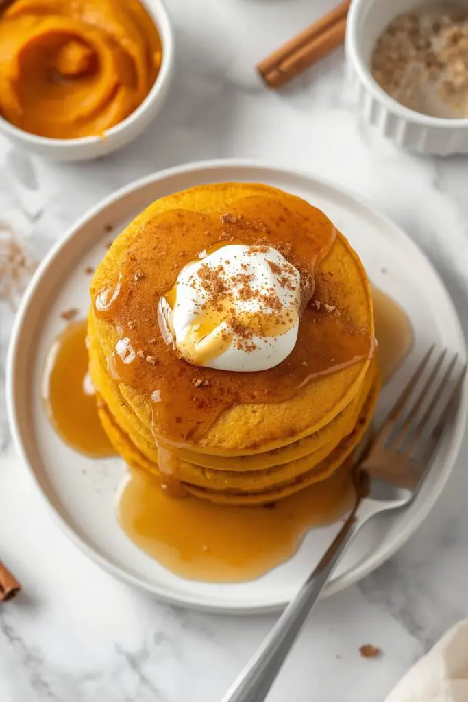 Description: Fluffy, golden pancakes infused with pumpkin puree, warm spices, and a scoop of protein powder. These pancakes are a cozy, protein-packed breakfast that delivers comfort and fuel in every bite, perfect for chilly fall mornings.