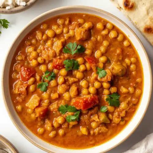 This version brings together protein-packed lentils and hearty chickpeas in a creamy tomato-coconut base, creating a dish that’s both nourishing and indulgent.