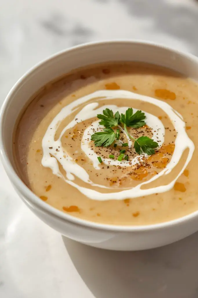 - Ladle soup into bowls, drizzle with extra cream, and garnish with fresh parsley or chives.