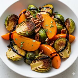 Caramelized Brussels sprouts meet the natural sweetness of roasted persimmons in this vibrant seasonal dish. Tossed with olive oil, herbs, and a touch of balsamic, it’s a comforting yet elegant side that adds warmth and color to any autumn or winter table.